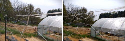 [3].그물망(오이망)의 상하측을 표시하는 2개의 검정색 부분 중에서 1개는 지지대 상단부에 연이어 걸치고 다른 1개는 지면의 아래 방향으로 늘어뜨립니다