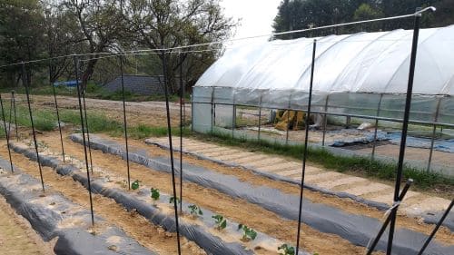 오이망,호랑이넝쿨강낭콩 유인용 그물망 및 지주대(지지대) 설치작업은 오이 모종을 정식하기 전이나 호랑이넝쿨강낭콩 종자를 파종하기 전에 설치하는 것이 기본원칙이지만 사정상 호랑이넝쿨강낭콩 종자를 파종한 이후 호랑이넝쿨강낭콩 유인용 지주대(지지대)와 그물망(오이망)을 설치하게 되었습니다