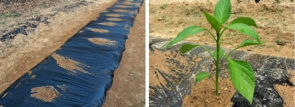 ②.1이랑 1줄 재배로 줄간격 150cm,두둑너비 50~60cm,두둑높이 20~30cm 정도로 이랑을 만들고 재배밭 포장을 흑색비닐로 멀칭합니다.파프리카 모종 심는 포기간격 35cm,심는깊이 10cm 정도로 흑색비닐 상측의 중앙 멀칭부를 천공하여 정식 구덩이를 만들고 구덩이에 물을 충분히 붓고 수분이 토양속 깊숙이 스며들도록 합니다